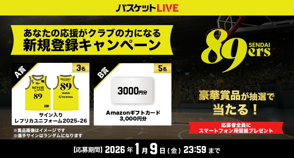 いつも仙台89ERS︎への黄援をありがとうございます。2025-26シーズンの開幕を記念し、「バスケットLIVE 新規登録キャンペーン」を実施いたします。