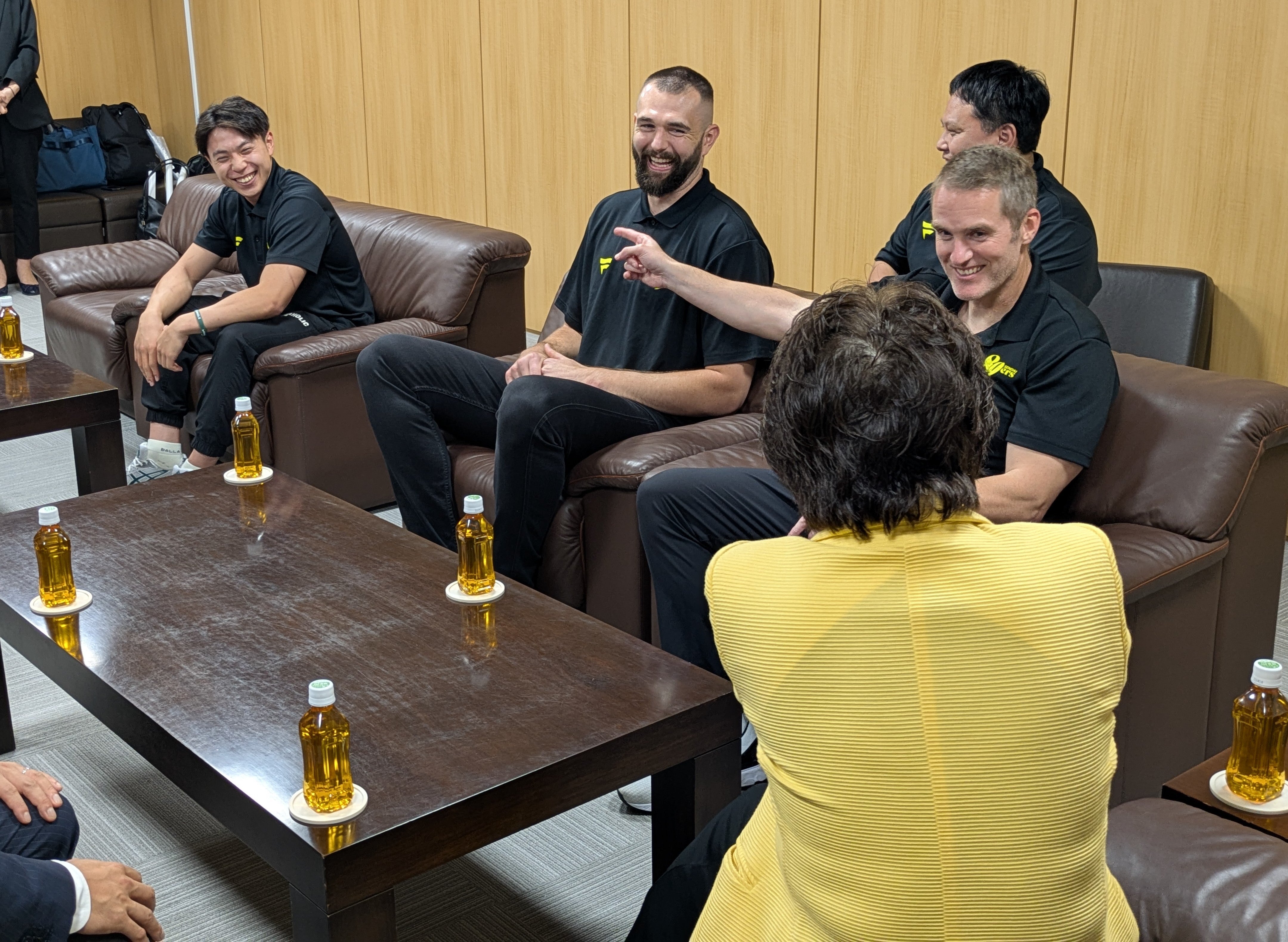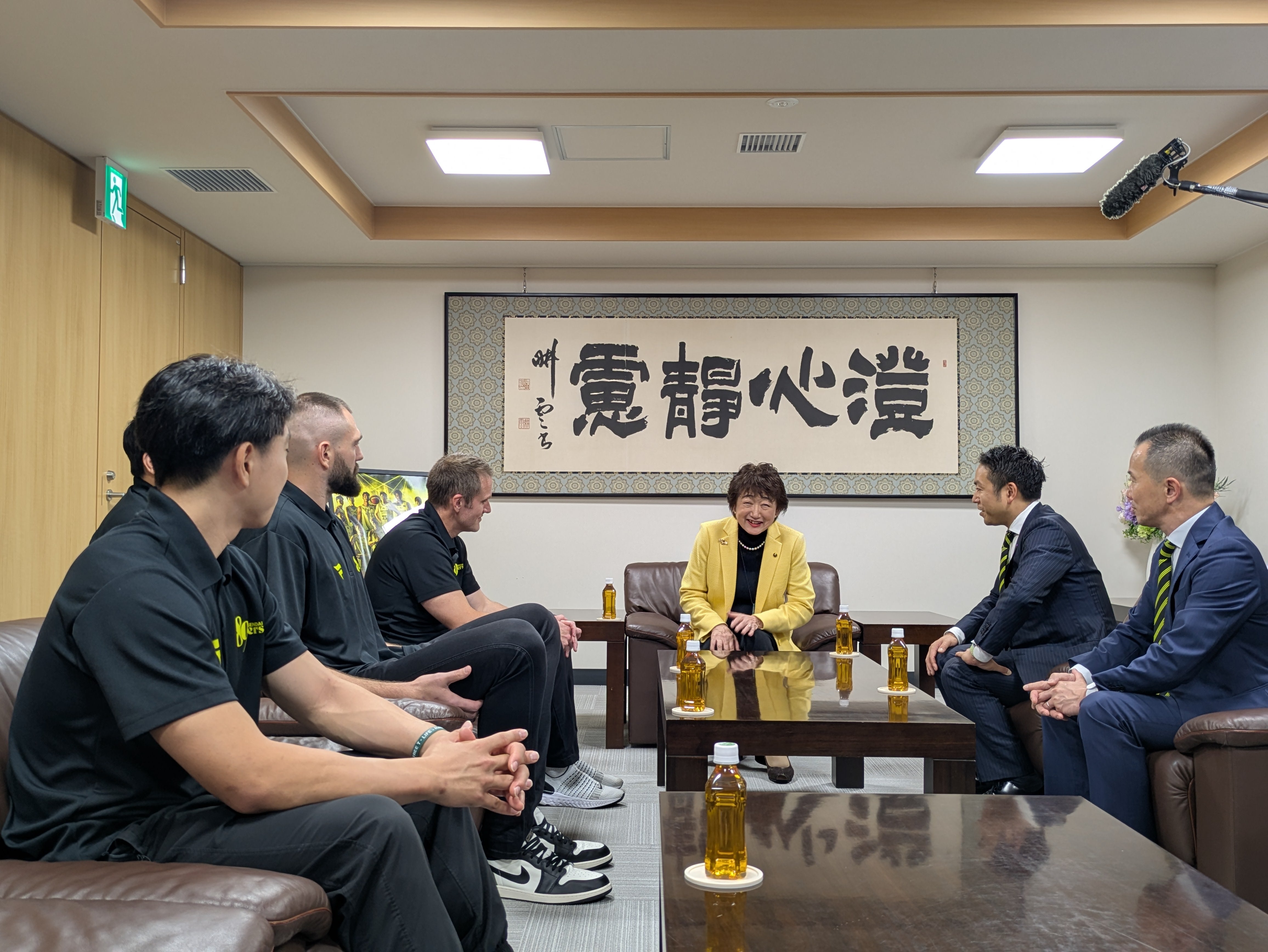 10月4日(土)に開幕する2025-26シーズンの決意表明のため、10月1日(水)、ダン・タシュニーヘッドコーチ、渡辺翔太選手、ネイサン・ブース選手、志村雄彦社長、成田健太郎常務取締役が仙台市の郡和子市長を表敬訪問いたしました。