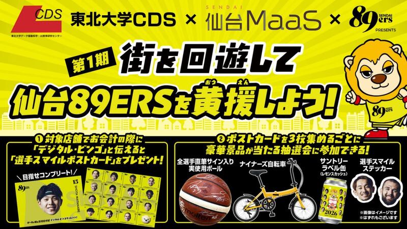 東北大学データ駆動科学・AI教育研究センター(CDS)と仙台の移動を便利にするウェブアプリ「仙台MaaS」 そして 仙台89ERS がタッグを組みデータで街を活性化する!デジタル・ビンゴチャレンジを1月17日(土)から実施!