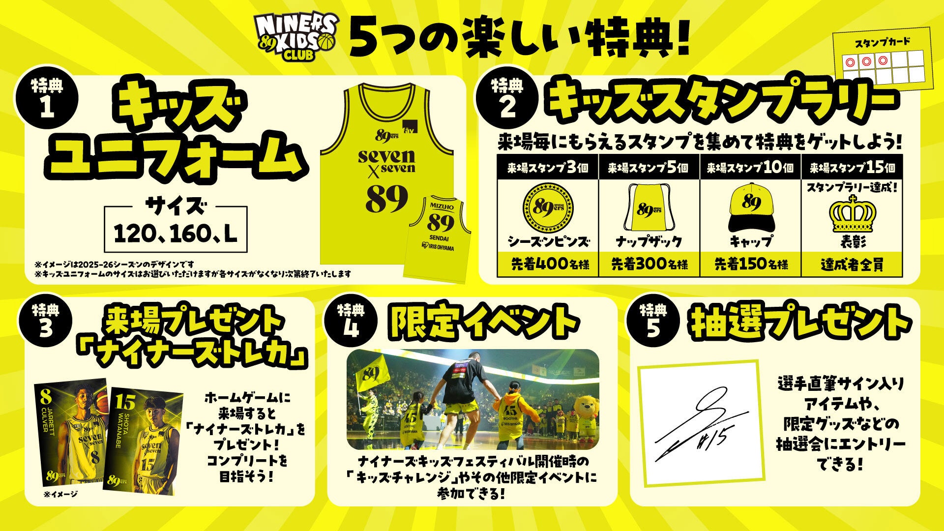 「キッズユニフォーム」や「キッズスタンプラリー」、「限定イベント」など5つの楽しい特典をご用意!