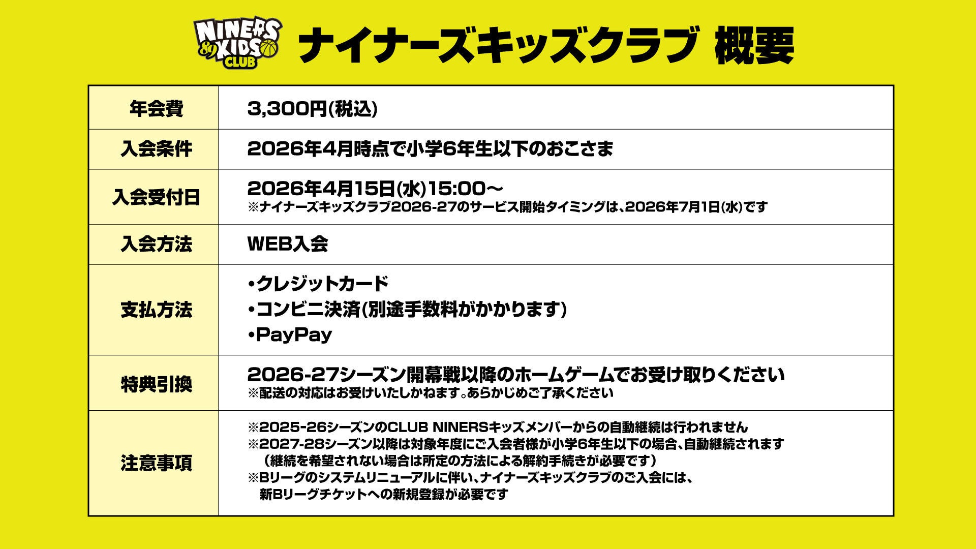 2025ー26シーズンまでの「CLUB NINERS」のキッズメンバーの対象であった中学生は「ナイナーズリワード」の対象です。