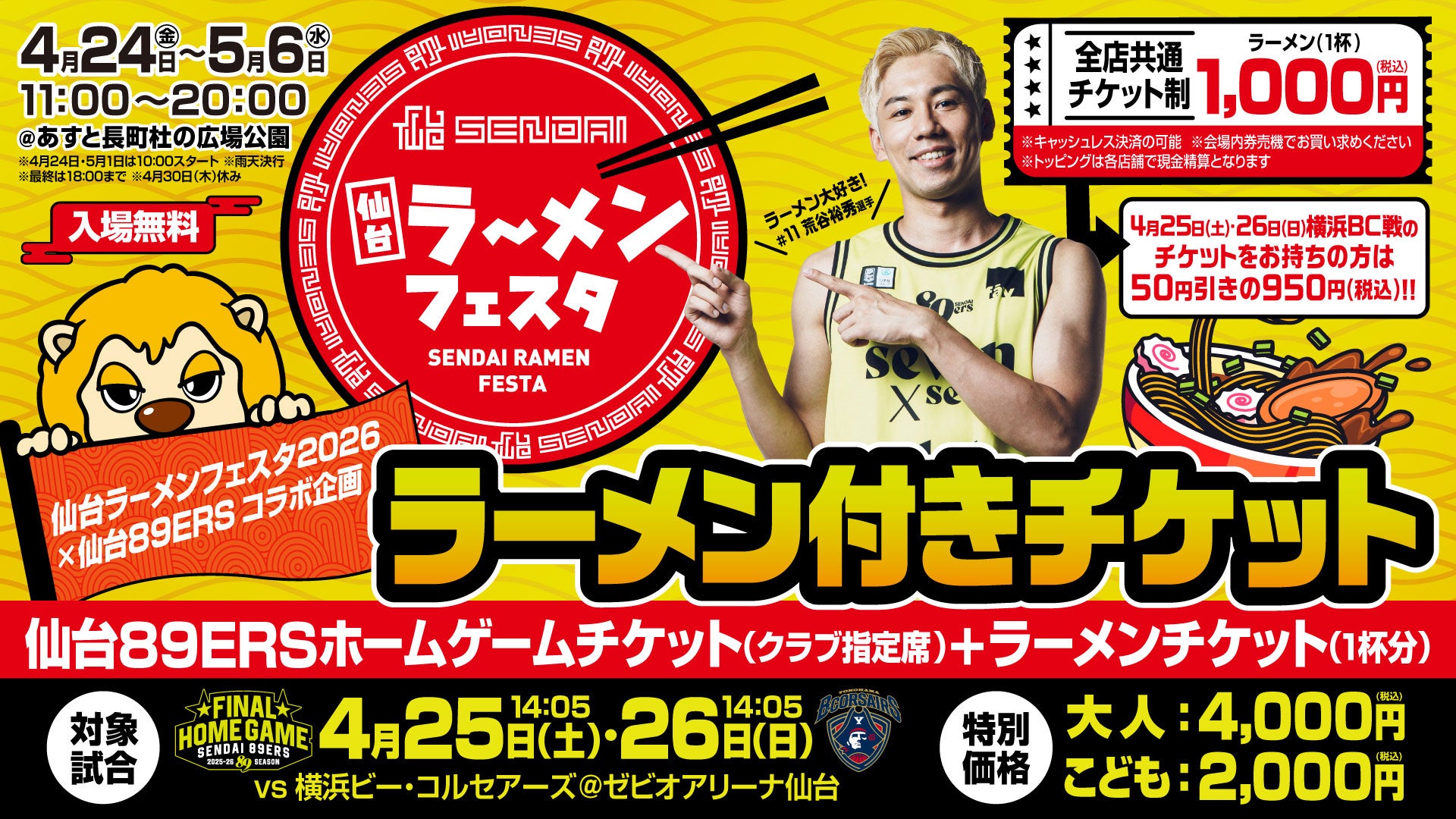 そこで、仙台89ERSのレギュラーシーズンホーム最終戦と、ラーメンフェスタで1日を思い切り楽しんでいただきたく、「ラーメン付きチケット」発売いたします!