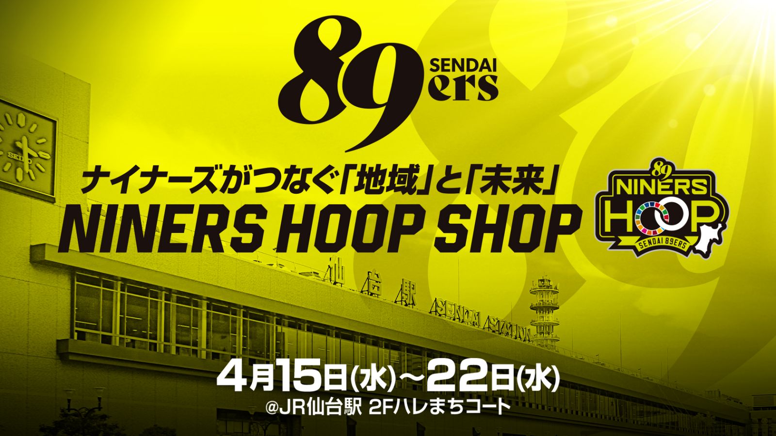 仙台89ERSは、地域とのつながりをさらに深めるポップアップイベント「NINERS HOOPショップ」を、2026年4月15日(水)から4月22日(水)までJR仙台駅2Fハレまちコートで開催いたします。
